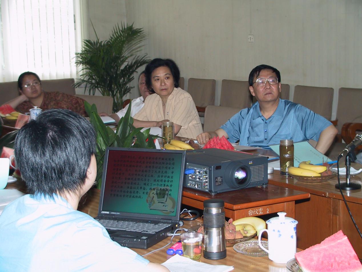 图为作者(左一)向时任审计署副审计长演示计算机辅助审计