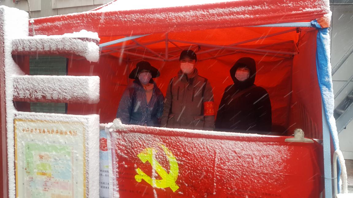 图为作者(右一)在社区冒雪值守