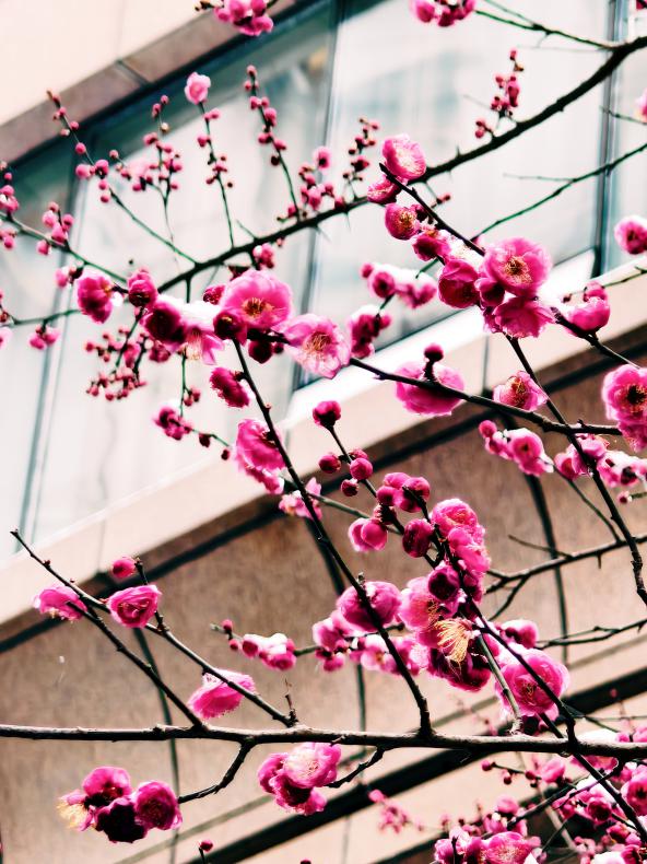 寒枝斜倚粉墙开,