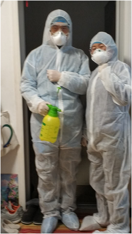 图为夫妻二人准备出门完成楼栋消毒2