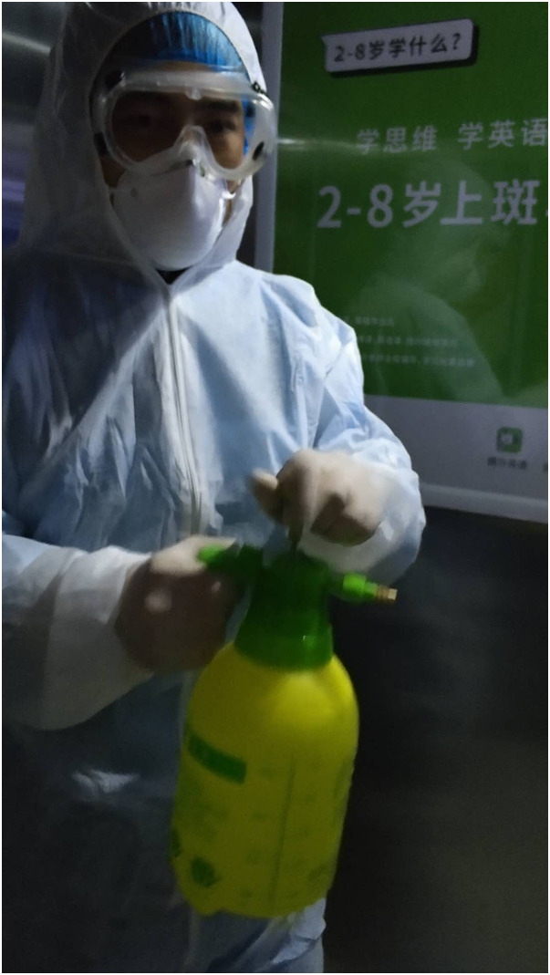 妻子负责按电梯,薛宁则从里向外,一边后退一边之字形消毒地面、门把手、楼梯扶手等,两人严谨细致地喷洒每一处角落、每一个隐蔽点。对确诊病人居住的两个楼层,更是冒着可能被感染的危险,来来回回进行了反复重点消杀。楼道里光线暗、杂物多,两人虽然小心翼翼地往后退行,还是时时会被停放的电动车、柜子绊到。等终于花一个多小时把全部24个楼层消毒完毕,两人早已浑身湿透,头套和护目镜里满是雾水。