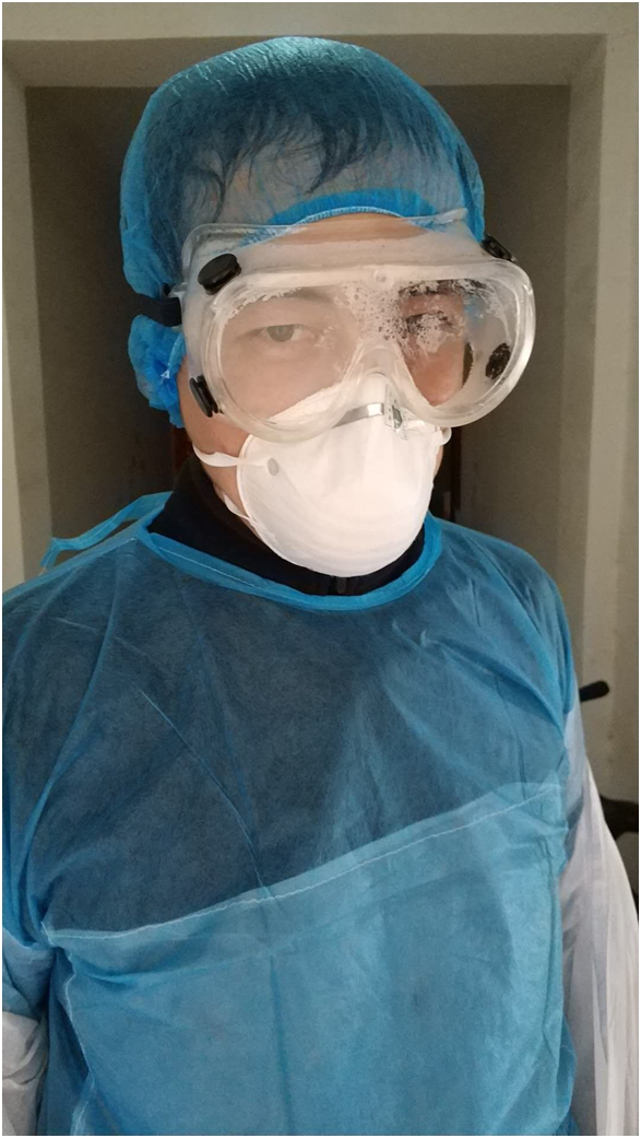 夫妻二人向同事朋友多方筹措,终于集齐了一次性手术衣、非医用型防护服、乳胶手套、头套、口罩、护目镜、大喷壶等必需的防护和消毒物品。脱下羽绒袄,穿上并不合身的简易防护服,再戴上护目镜,雾气顿时就模糊了视线,让薛宁也不禁有点慌乱。在妻子不经意的调侃中,两人终于准备完毕,拿上按1:200比例调配好的84消毒溶液出门开始进行消杀。