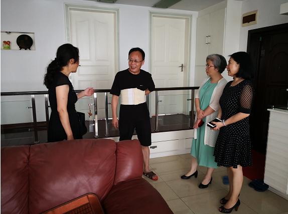 图为慰问人员与打着石膏板的吴长江(左二)亲切交谈