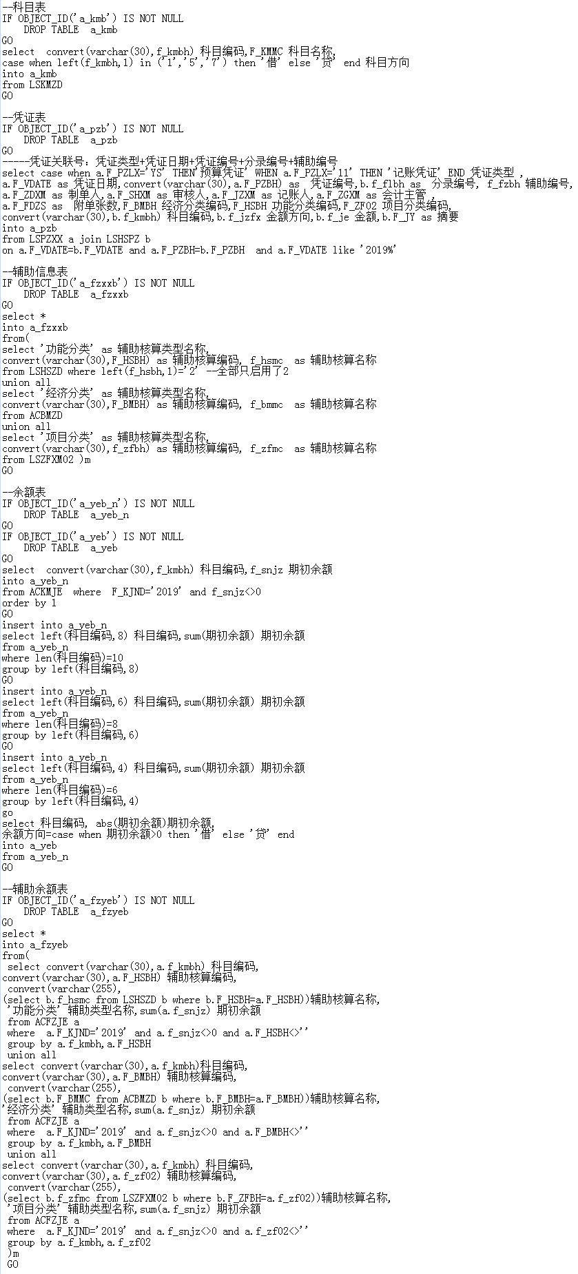 根据分析出的表,整理生成六张标准表(其中,凭证表与凭证辅助明细表是同一张表),生成语句如下: