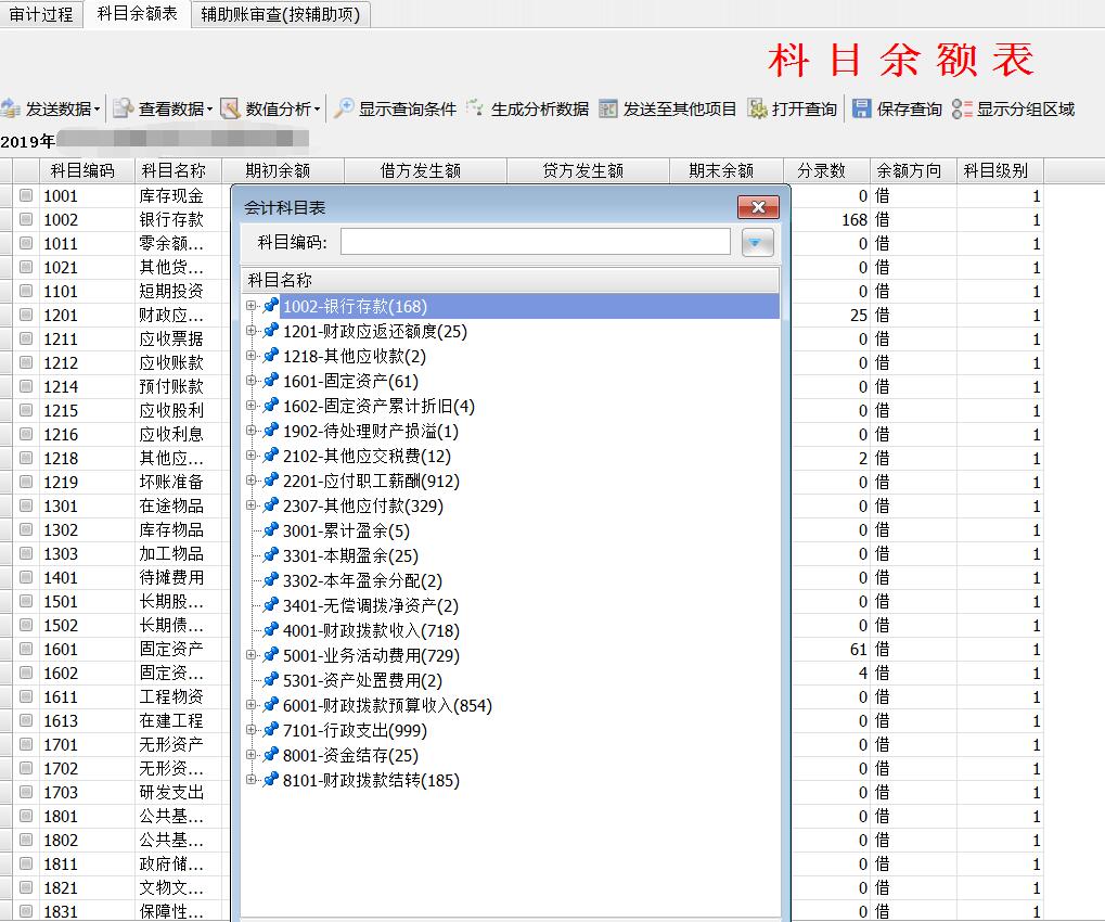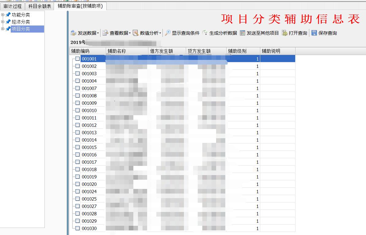 形成AO账套后,可与采集的前台数据进行核对,所有余额、发生额均一致。打开会计科目审查可查看1-5为会计科目,6-8为预算科目,打开辅助账审查--按辅助项,共有功能分类、经济分类、项目分类三种辅助核算,如图:
