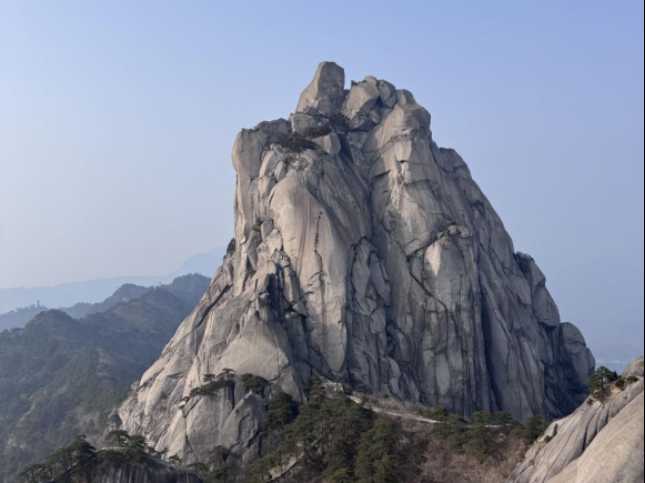 拾级而上,放眼四望,但见群峰连绵,气势非凡。眼前这座巍峨巨峰,乃天柱山之标志胜景,其形如巨柱擎天,直入云霄,岩壁上纵横交错的纹理,宛如岁月镌刻的诗行,亦似审计人笔下细致严谨的印记。峰顶一石,若天外飞来,安然立于绝巅,映衬着蓝天白云,愈发显得沉稳庄重。此情此景,让人顿悟:审计工作之每一处核查、每一份报告,亦当如这飞来石般,稳如磐石,经得起检验,守得住根基。