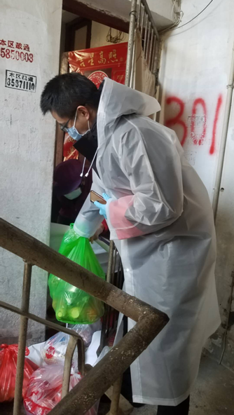 2月16日,行事一处驻守六角亭街六角社区教工宿舍小区的党员干部吴震雄、彭蓉晖、夏坤同志帮助小区群众在购物网站上采买蔬菜和生活必需品,并送到封闭的教工宿舍小区居民家中,受到居民群众的一致称赞。