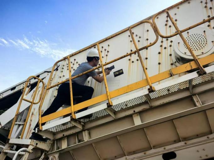 图为审计人员核查建筑垃圾处理设备铭牌信息