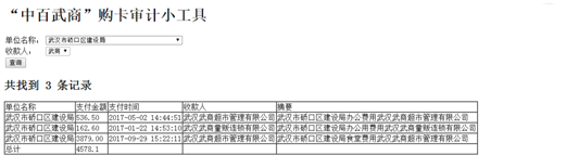 “单位名称”选项选择要审查的单位,“收款人”选项选择“武商”,点击“查询”按钮,下方会显示查询到的记录条数、具体搜索到的信息及汇总金额。