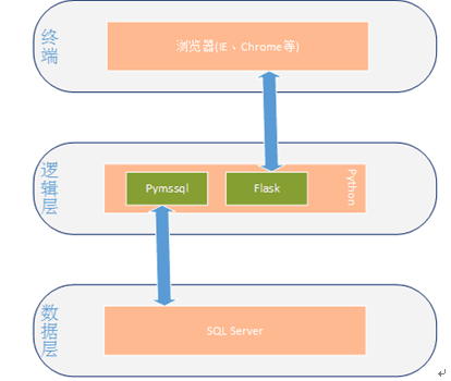数据层使用SQLSERVER作为数据存储和管理工具;对数据的访问使用python+pymssql方式,便于获取和更新数据;逻辑层使用python+flask组合实现对用户web请求的处理和html页面渲染下发。使用者通过任意浏览器即可访问该系统。