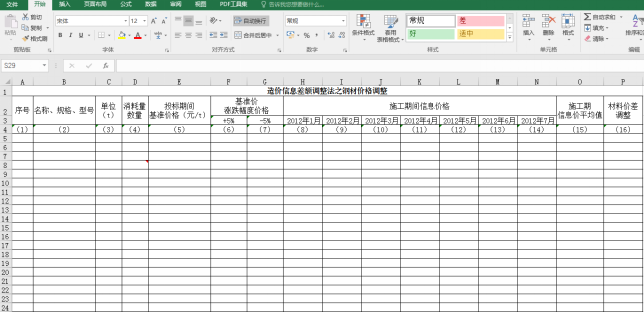 1、新建电子表格,建立表格基础信息名称。主要包括标题名称,表格中涉及的钢材名称、规格型号、材料单位、消耗量数量,调价风险系数等信息。
