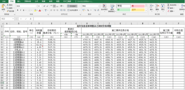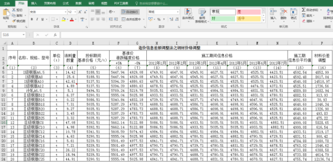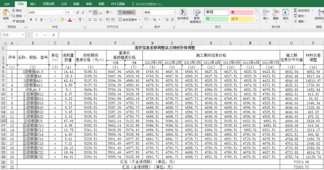 2、在电子表格单元格直接输入基础数据。主要包括钢筋名称规格型号、消耗量数量、投标期间基准价、施工期间各月信息价等主要数据。